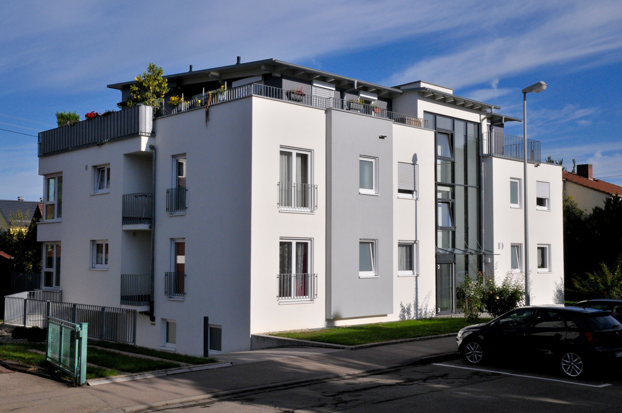 Ein Wechselspiel aus Glas- und Putzflächen, Vor- und Rücksprüngen bestimmt die Fassade des 5-Familienhauses in Metzingen. Das zurückgesetzte Dachgeschoss mit Pultdach ist mit Platten verkleidet.