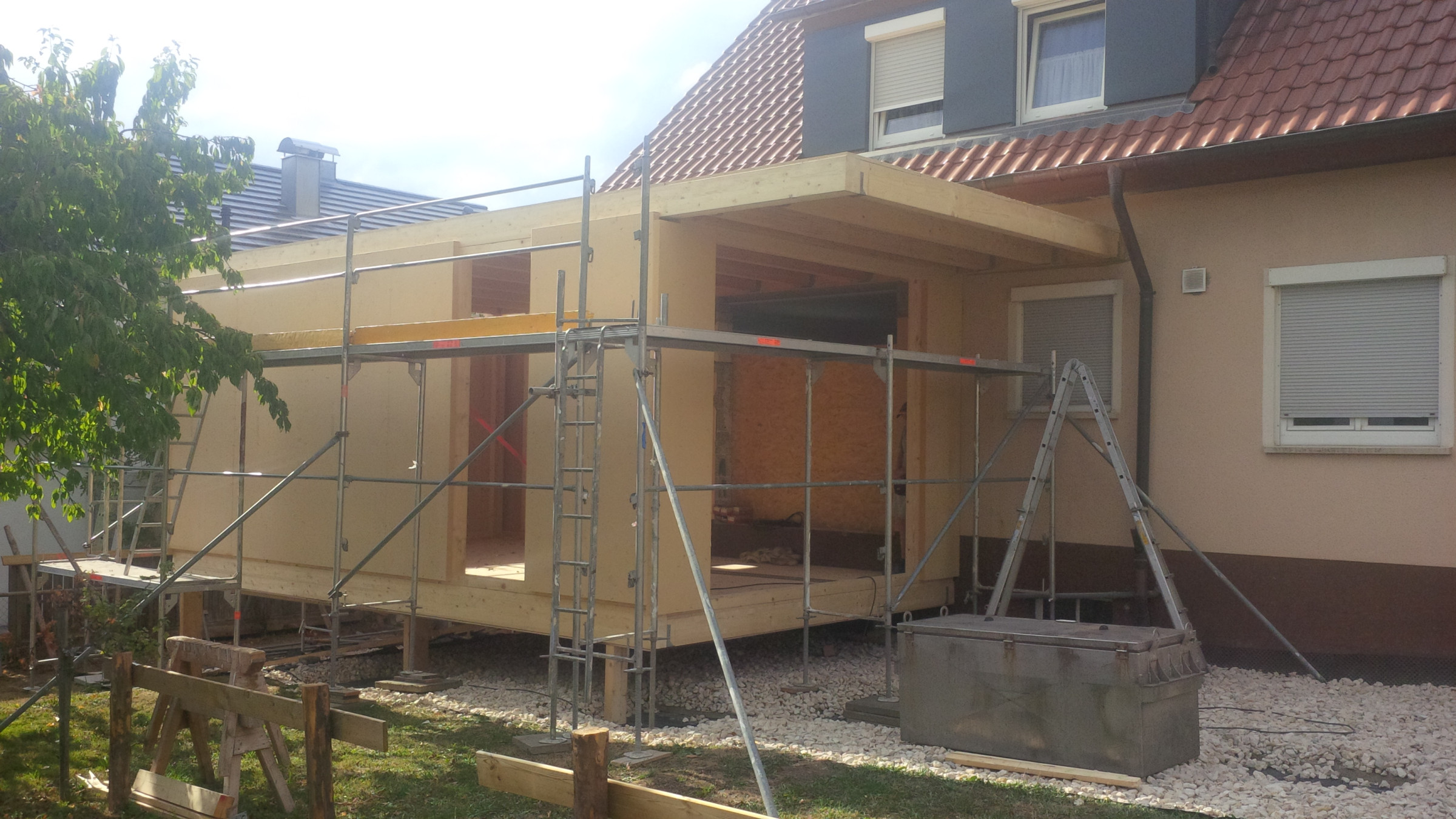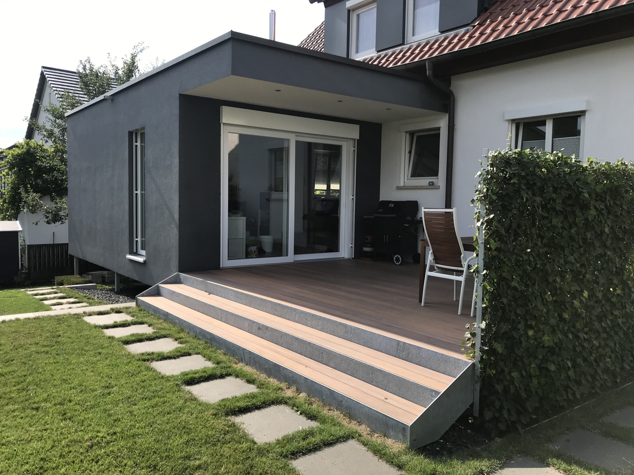 Die Wohnungsgrössen in dem Haus aus den 70ern entsprachen nicht mehr den heutigen Ansprüchen. So wurde im Erdgeschoss in Holzbauweise ein zusätzlicher Wohnraum mit anschliessender Terrasse angebaut. Die Wohnung im Obergeschoss bleibt in ihrer bisherigen Form erhalten.