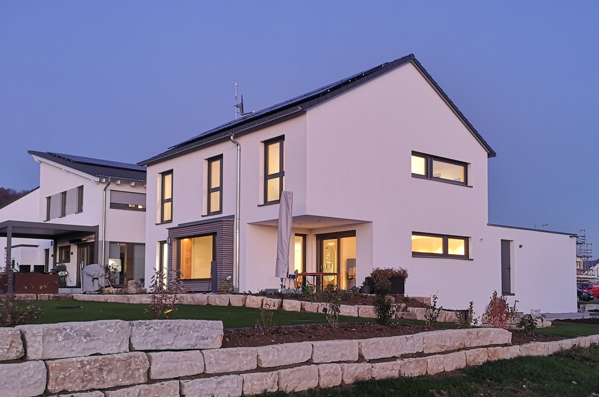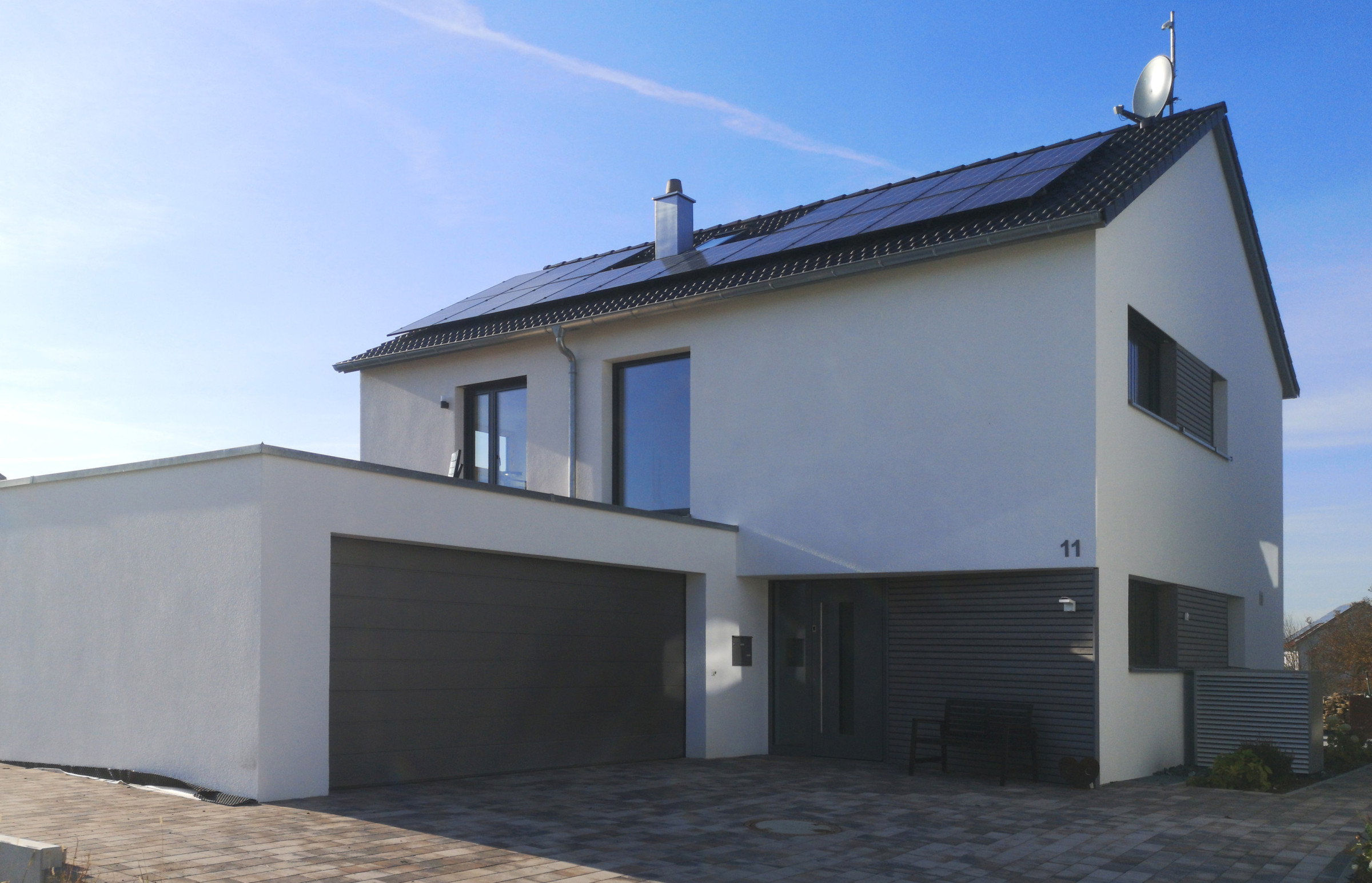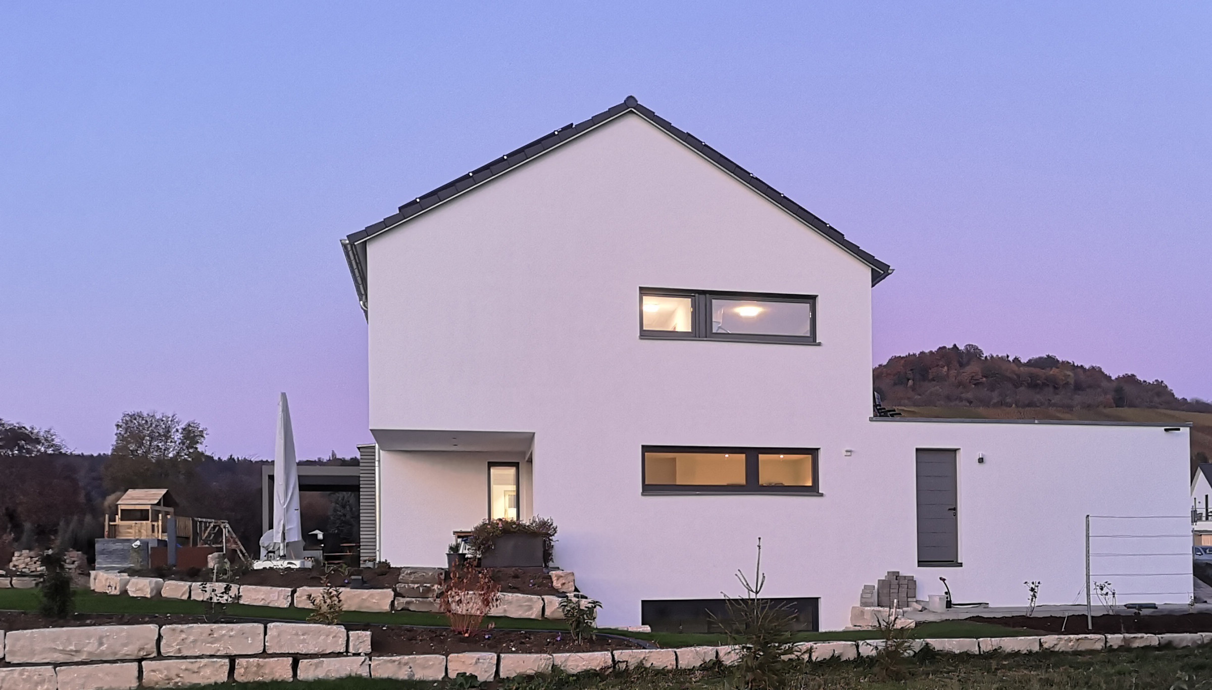 Platz für einen großen Esstisch und ein Sitzfenster, die Küche sollte abtrennbar sein und das Treppenhaus nicht im Wohnbereich. Dazu noch 1-2 Arbeitszimmer und eine Ankleide wäre toll,… auch eine überdachte Terrasse sowie eine große Garage standen auf der Wunschliste – Die Wünsche konnten alle erfüllt werden und in enger Zusammenarbeit mit Fa. Kleih aus Dettingen wurde das Wohnhaus als KFW-Effizienzhaus 55 in Holzständerbauweise errichtet. Geheizt wird mit einer Luft-Wasser-Wärmepumpe, unterstützt durch eine großflächige PV-Anlage auf dem Dach.
