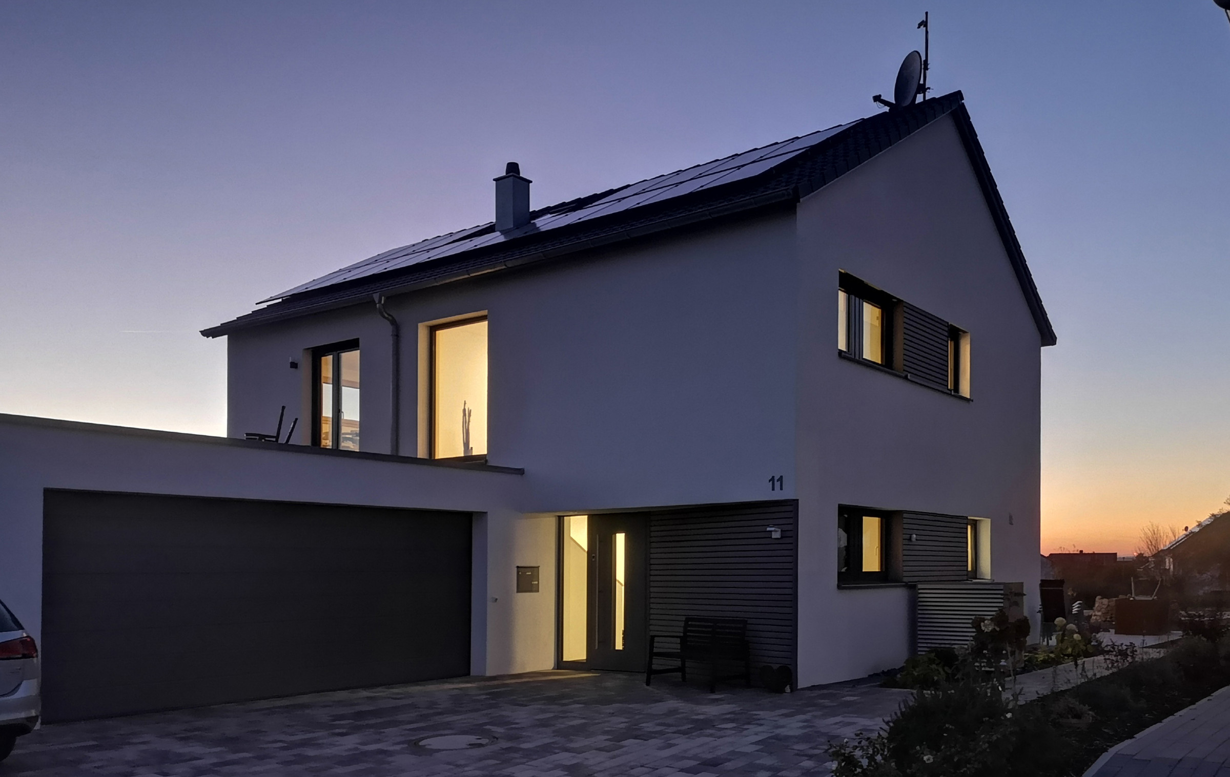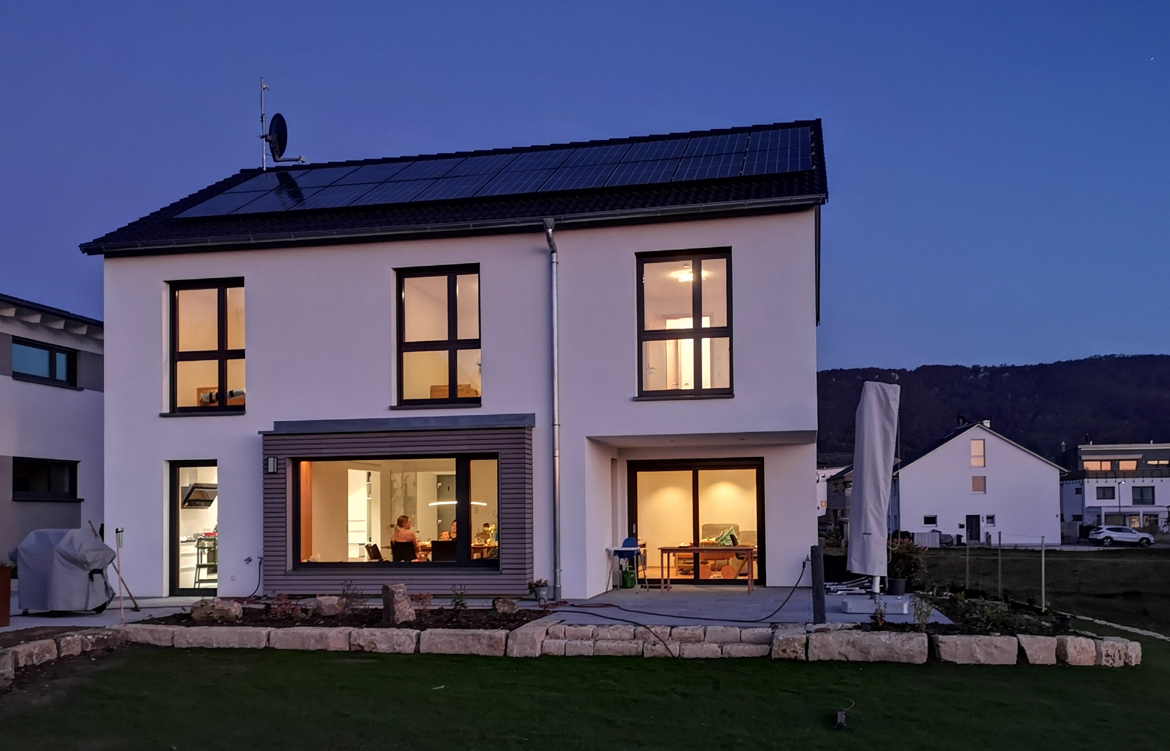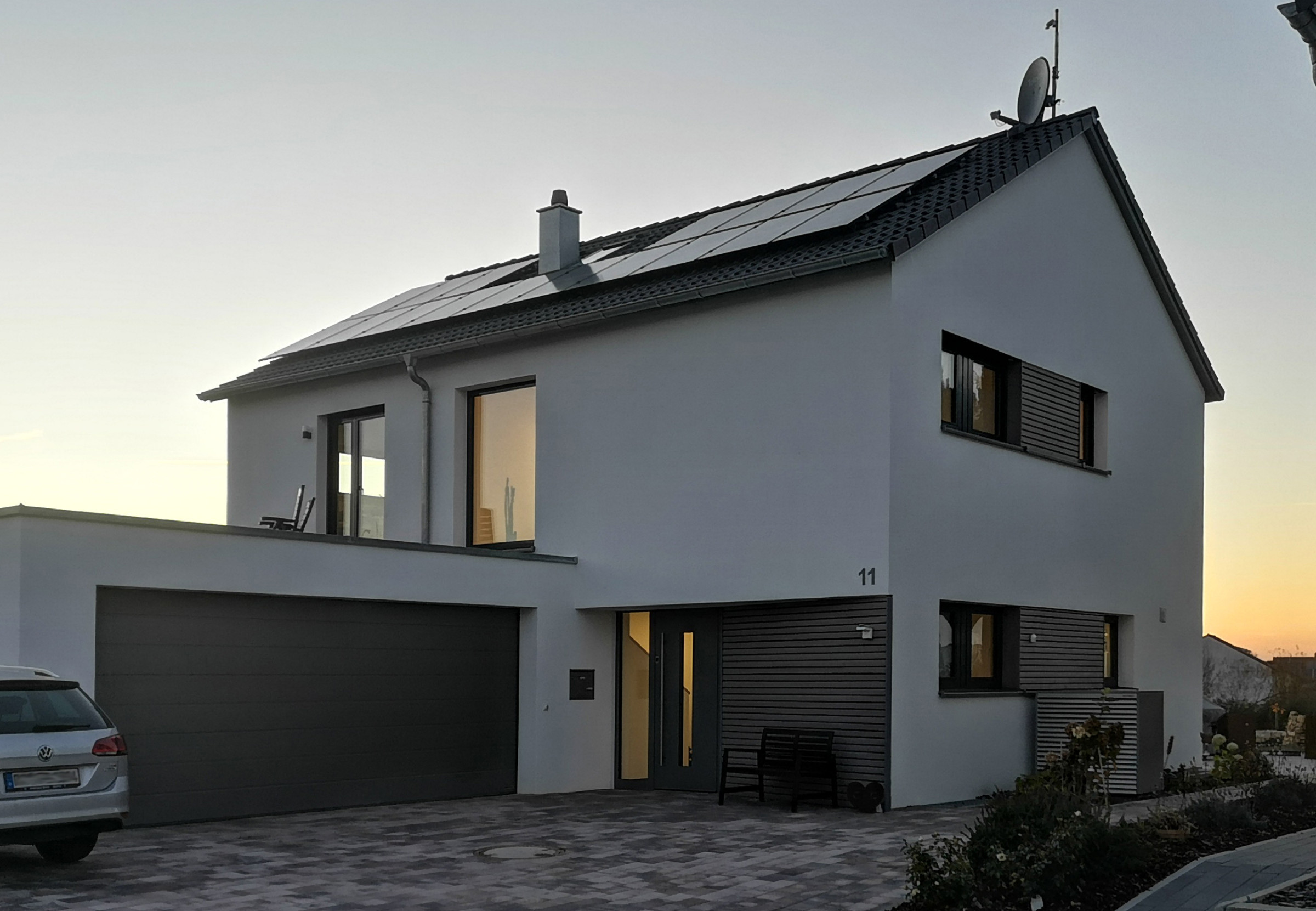 Platz für einen großen Esstisch und ein Sitzfenster, die Küche sollte abtrennbar sein und das Treppenhaus nicht im Wohnbereich. Dazu noch 1-2 Arbeitszimmer und eine Ankleide wäre toll,… auch eine überdachte Terrasse sowie eine große Garage standen auf der Wunschliste – Die Wünsche konnten alle erfüllt werden und in enger Zusammenarbeit mit Fa. Kleih aus Dettingen wurde das Wohnhaus als KFW-Effizienzhaus 55 in Holzständerbauweise errichtet. Geheizt wird mit einer Luft-Wasser-Wärmepumpe, unterstützt durch eine großflächige PV-Anlage auf dem Dach.