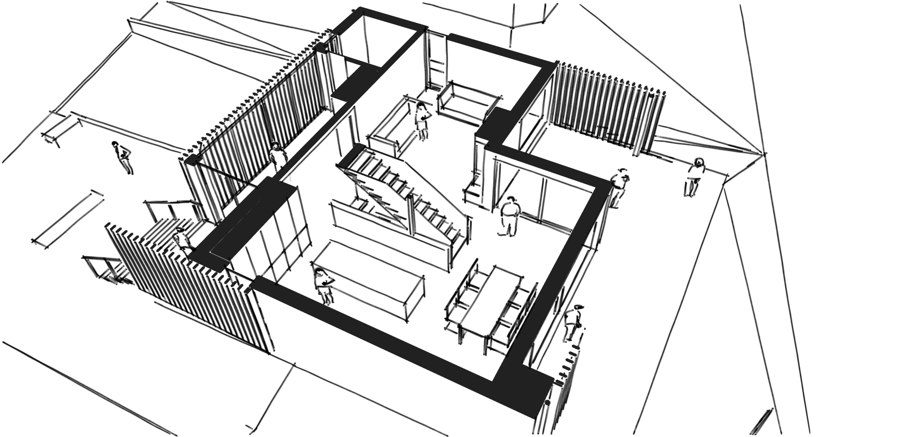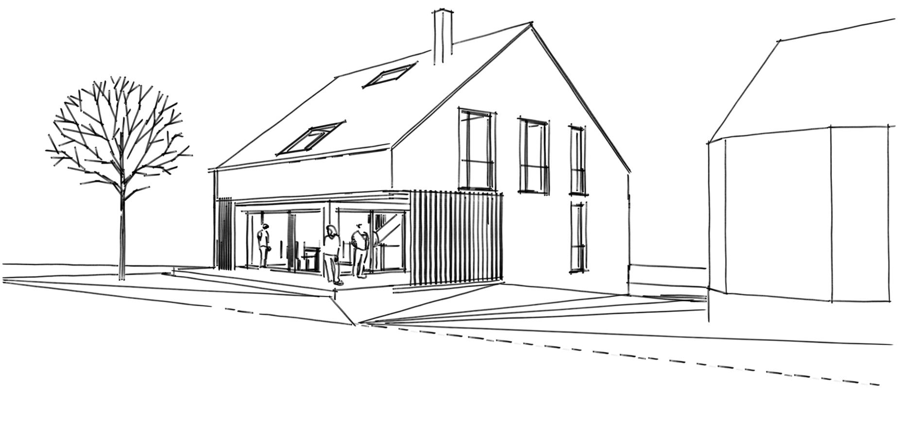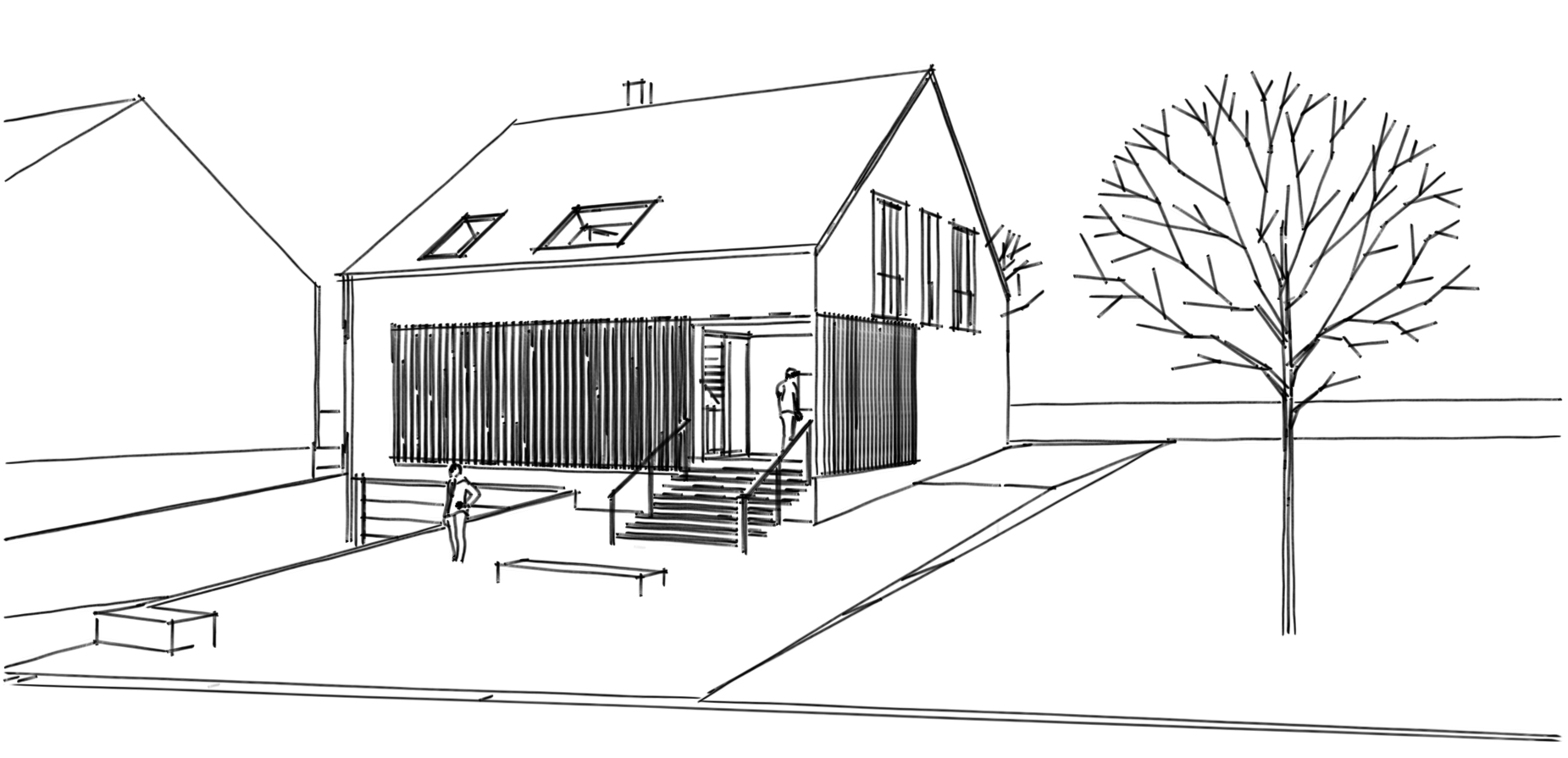 Das trifft auf unsere Bauherren ebenso zu wie auf das sich derzeit im Bau befindende Wohnhaus. Fließende Übergänge von innnen und außen mit möglichst wenig Trennwände und Türen im Erdgeschoss. Ein Filter aus Holzlamellen schafft Privatsphäre.