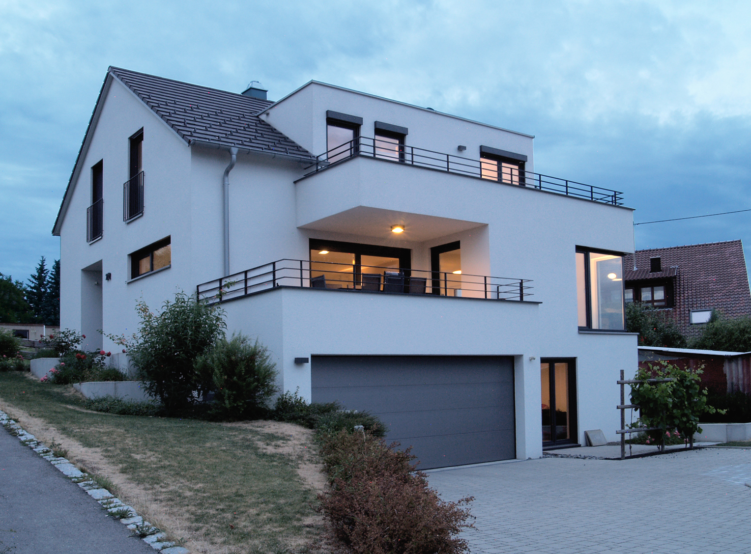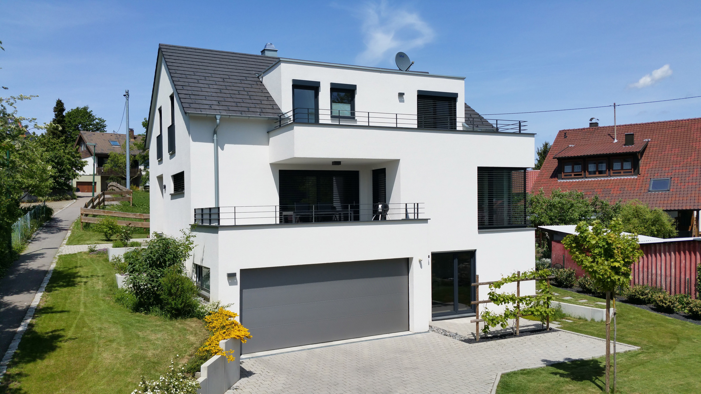Die Dachform und -Neigung ist ebenso wie die Traufhöhe durch den Bebauungsplan festgelegt. Die Erschliessung erfolgt durch eine schmale Stichstrasse von Süden, die Doppelgarage ist in das Gebäude integriert und wird im Erdgeschoss als Terrasse genutzt. Der Hauszugang selbst erfolgt über den öffentlichen Fussweg auf der Westseite.
